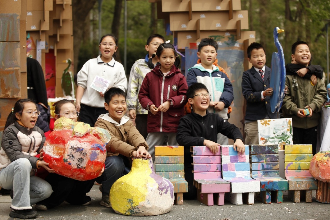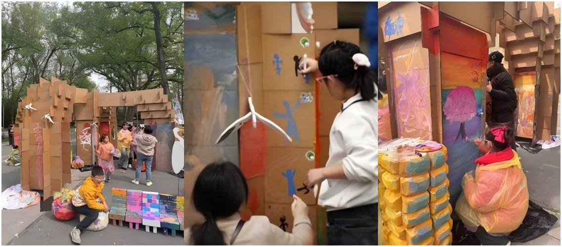 在"情绪树"搭建、创作环节,来自南京市方兴小学的学生和家长利用瓦楞纸搭建"情绪树"并进行绘画创作,参与者不仅感受到了艺术创作的乐趣,同时也认识了自己的景观感知方式与情绪表达需求。