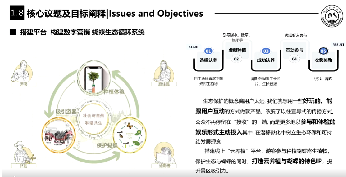 设计立足汤山特色动植物资源,创新提出"文化为魂·蝴蝶为媒"的生态文旅发展范式,即打造蝴蝶主题沉浸式体验场景,对接长三角文旅市场需求;开发智慧化互动产品,联动周边景区形成旅游闭环;构建数字营销与生态循环双平台,创新野生动物友好型城市发展模式。采用数字化互动营销策略,实现生态保护与文旅发展的有机统一。