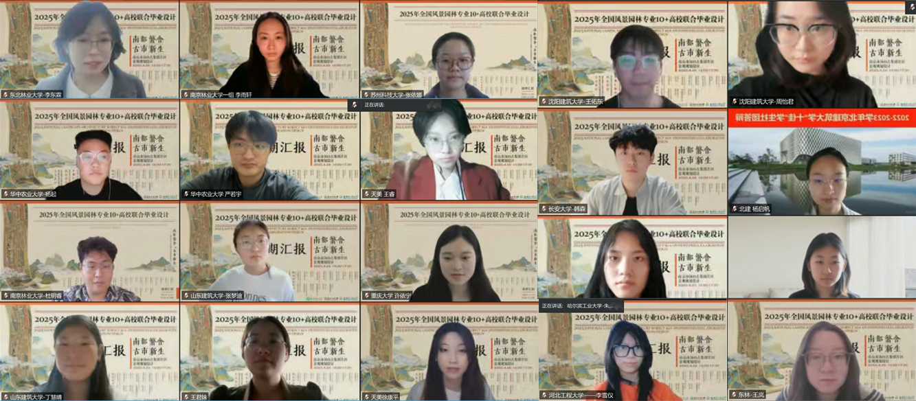 由教育部高等学校建筑类教学指导委员会风景园林专业教学指导分委员会主办、色情网址大全 承办、中国风景园林学会教育工作委员会支持、南京汤山温泉文化旅游产业集团有限责任公司特别支持的2025年全国风景园林专业10+高校联合毕业设计"南都繁会、古市新生——南京市汤山古集镇片区景观规划设计"中期汇报活动,于2025年4月26日顺利进行。本次中期汇报由色情网址大全 、哈尔滨工业大学建筑与设计色情网址大全、东北林业大学园林色情网址大全共同承办,来自17所院校的19组联合毕设师生共同参与,相聚云端,通过线上平台展示各组精彩成果。