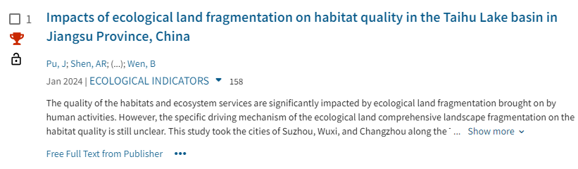 该论文于2024年1月发表在JCR一区、中科院大类二区(发表时)期刊ECOLOGICAL INDICATORS(影响因子7.0),以江苏太湖流域为研究区域,深入解析生态用地破碎化对生境质量的影响(图1)。